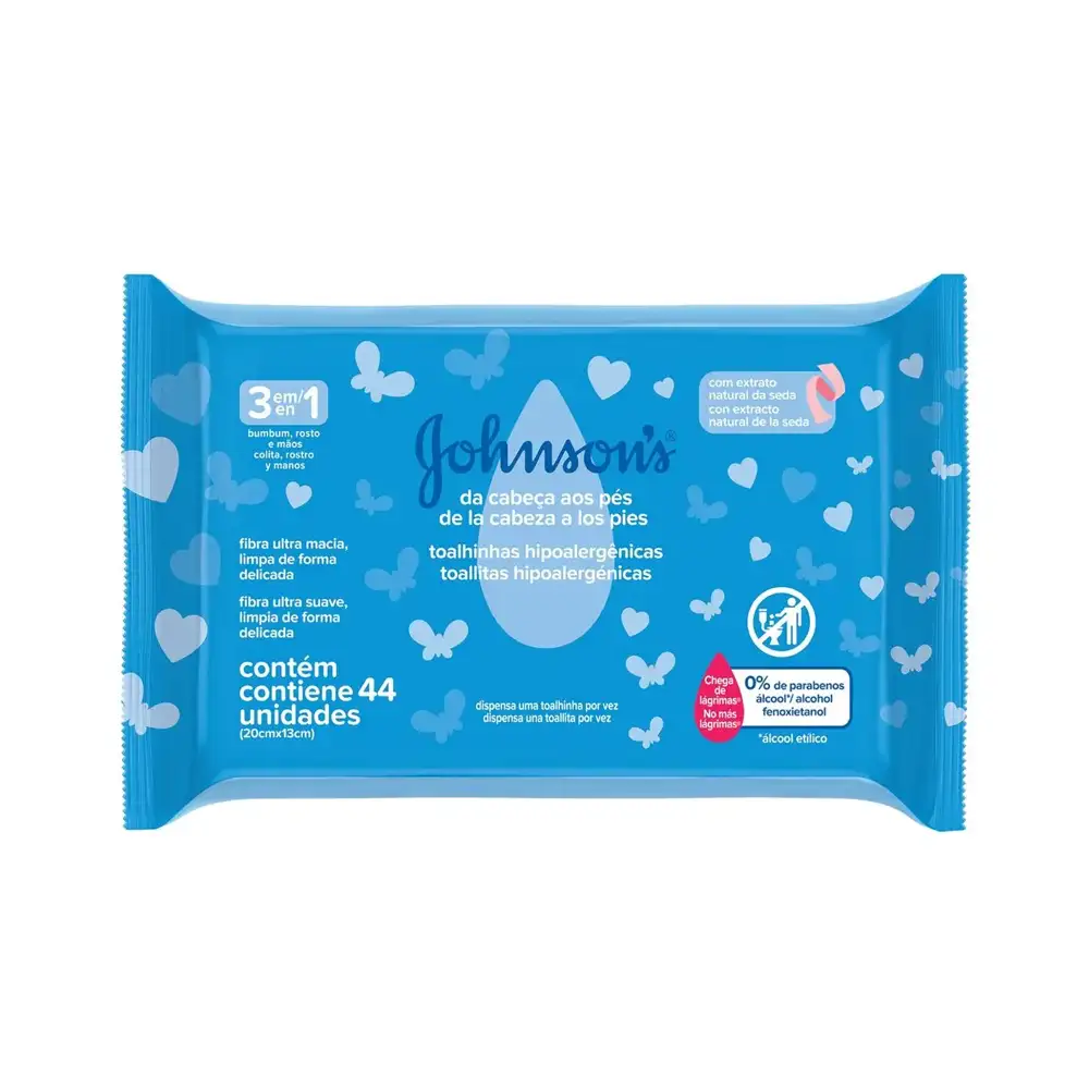 Toallitas húmedas Johnson’s «De la Cabeza a los Pies»: limpieza suave con extracto de seda, perfectas para la piel delicada de tu bebé.