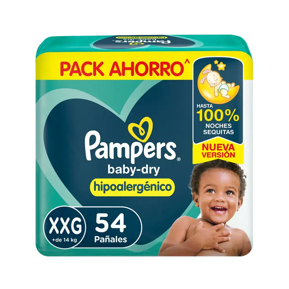 Pampers Baby-Dry Talle XXG x54, pañales cómodos y absorbentes ideales para bebés más grandes.