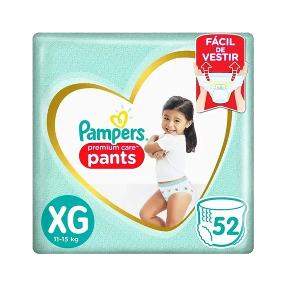 Pañales Pampers Premium Care Pants XG x52, la mejor protección en formato pantalón. Ajuste perfecto, suavidad como algodón y ultra respirables para mantener a tu bebé fresco y cómodo. Fáciles de poner, quitar y desechar, para padres y bebés activos. Protección y comodidad en un solo pañal.